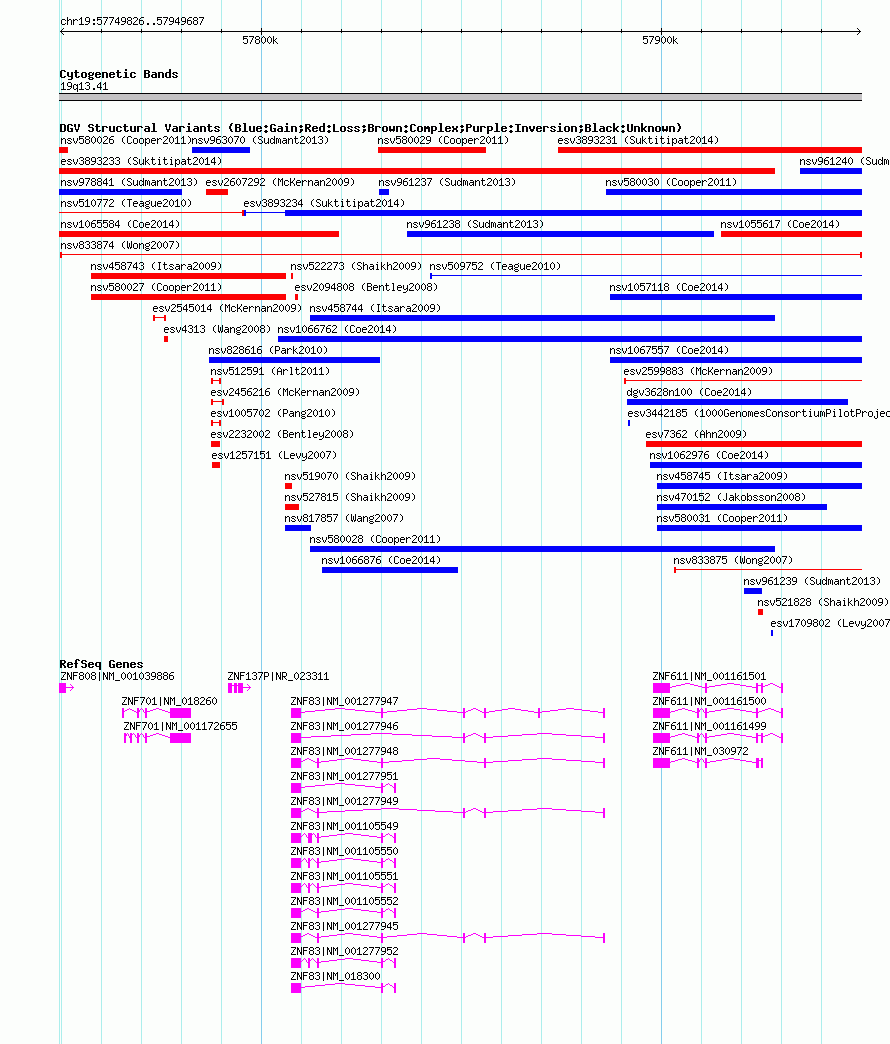 Variant DetailsVariant: nsv833874 | Internal ID | 16457743 | | Landmark | | | Location Information | | | Cytoband | 19q13.41 | | Allele length | | Assembly | Allele length | | hg38 | 199862 | | hg19 | 199862 | | hg18 | 199862 | | hg17 | 199862 |