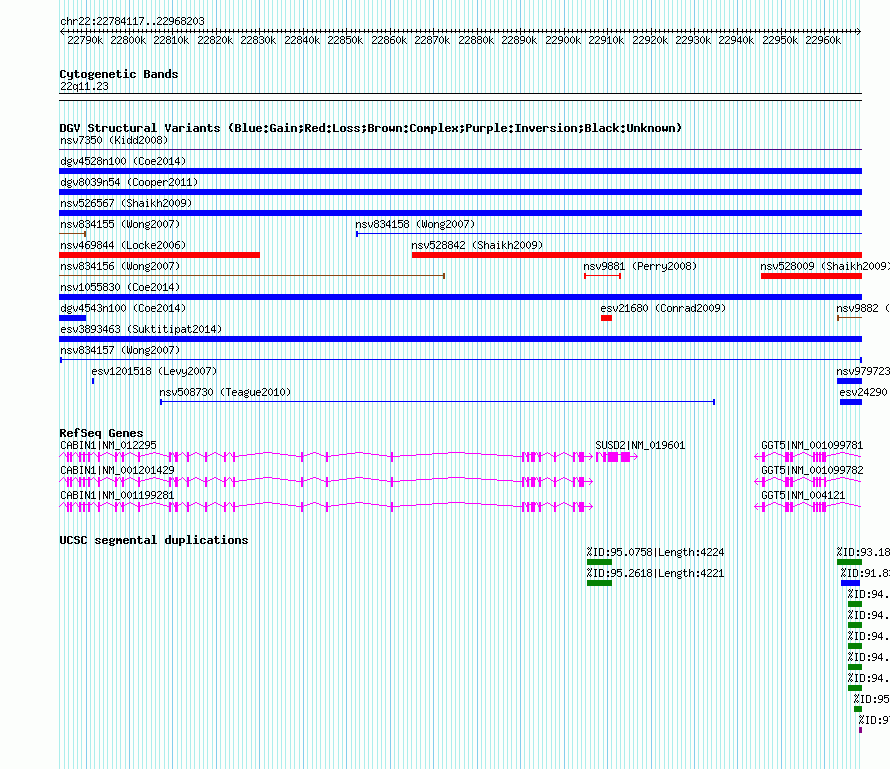 Variant DetailsVariant: nsv834157 | Internal ID | 16111340 | | Landmark | | | Location Information | | | Cytoband | 22q11.23 | | Allele length | | Assembly | Allele length | | hg38 | 184582 | | hg19 | 184087 | | hg18 | 184087 | | hg17 | 184087 |