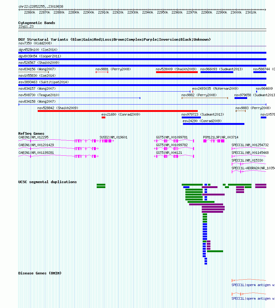 Variant DetailsVariant: nsv834158 Internal ID | 16111341 | Landmark | | Location Information | | Cytoband | 22q11.23 | Allele length | Assembly | Allele length | hg38 | 167583 | hg19 | 167584 | hg18 | 167584 | hg17 | 167584 |
