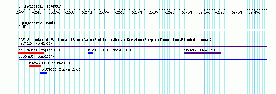 Variant DetailsVariant: nsv834226 | Internal ID | 16458095 | | Landmark | | | Location Information | | | Cytoband | 2p15 | | Allele length | | Assembly | Allele length | | hg38 | 148987 | | hg19 | 148987 | | hg18 | 148987 | | hg17 | 148987 |