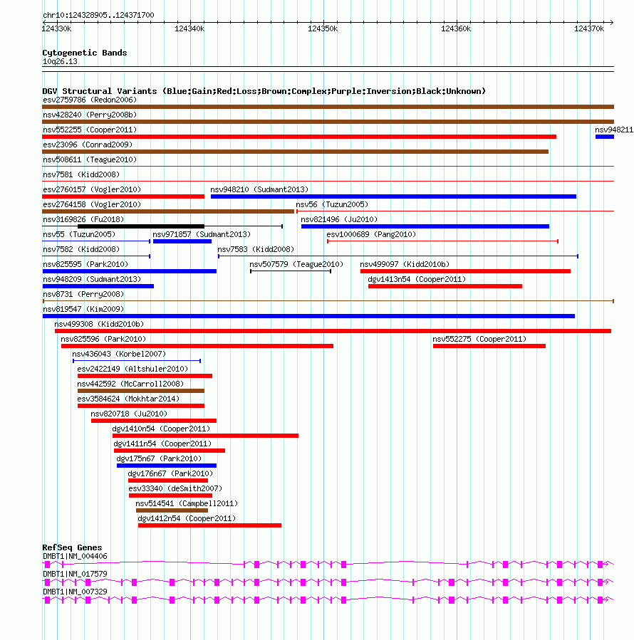 Variant DetailsVariant: nsv8731 | Internal ID | 15846643 | | Landmark | | | Location Information | | | Cytoband | 10q26.13 | | Allele length | | Assembly | Allele length | | hg38 | 42796 | | hg19 | 42796 | | hg18 | 42796 | | hg17 | 42796 |