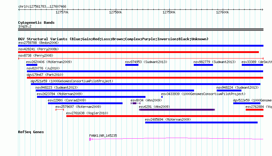 Variant DetailsVariant: nsv8738| Internal ID | 15846650 | | Landmark | | | Location Information | | | Cytoband | 10q26.2 | | Allele length | | Assembly | Allele length | | hg38 | 45684 | | hg19 | 45684 | | hg18 | 45684 | | hg17 | 45684 |
