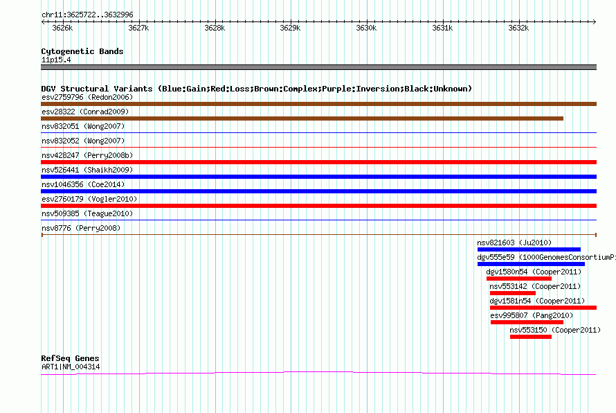 Variant DetailsVariant: nsv8776 | Internal ID | 15500002 | | Landmark | | | Location Information | | | Cytoband | 11p15.4 | | Allele length | | Assembly | Allele length | | hg38 | 7275 | | hg19 | 7275 | | hg18 | 7275 | | hg17 | 7275 |
