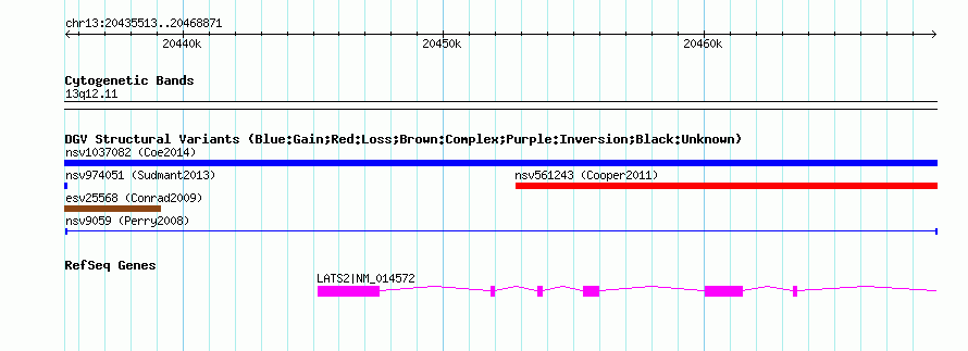 | Variant Type | CNV gain | Copy Number | | Allele State | | Allele Origin | | Probe Count | | Validation Flag | | Merged Status | M | Merged Variants | | Supporting Variants | nssv26416, nssv24552 | Samples | NA18860, NA19221 | Known Genes | LATS2 | Method | Oligo aCGH | Analysis | Statistical threshold = 5.0, minimum +/- log2 ratio = 0.25 and minimum number of probes = 2 | Platform | Agilent-015686 Custom Human 244K CGH Microarray | Comments | | Reference | Perry_et_al_2008 | Pubmed ID | 18304495 | Accession Number(s) | nsv9059