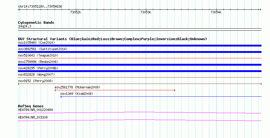 | | Variant Type | CNV gain+loss | | Copy Number | | | Allele State | | | Allele Origin | | | Probe Count | | | Validation Flag | | | Merged Status | M | | Merged Variants | | | Supporting Variants | nssv20342, nssv21213, nssv23771, nssv21655, nssv21977, nssv21206, nssv20916, nssv21468, nssv22179, nssv22969, nssv19852, nssv24035, nssv25253 | | Samples | NA18980, NA07029, NA18504, NA18563, NA18860, NA18942, NA07048, NA19007, NA10863, NA18564, NA19240, NA19144, NA12740 | | Known Genes | HEATR4 | | Method | Oligo aCGH | | Analysis | Statistical threshold = 5.0, minimum +/- log2 ratio = 0.25 and minimum number of probes = 2 | | Platform | Agilent-015686 Custom Human 244K CGH Microarray | | Comments | | | Reference | Perry_et_al_2008 | | Pubmed ID | 18304495 | | Accession Number(s) | nsv9152