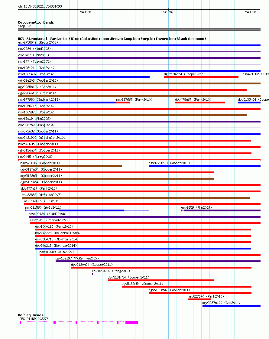 | | Variant Type | CNV loss | | Copy Number | | | Allele State | | | Allele Origin | | | Probe Count | | | Validation Flag | | | Merged Status | M | | Merged Variants | | | Supporting Variants | nssv22536, nssv23031, nssv23671, nssv20539, nssv23101, nssv23643, nssv24963, nssv23270, nssv24359, nssv26607, nssv21622, nssv23540, nssv24411, nssv23129, nssv26366, nssv23773, nssv23157, nssv23746, nssv23568, nssv24913, nssv21562, nssv24385, nssv24938, nssv21592, nssv23719, nssv20509, nssv23512, nssv23298 | | Samples | NA11830, NA18980, NA12155, NA18563, NA18942, NA07048, NA10839, NA10863, NA18572, NA18537, NA18517, NA18564, NA18972 | | Known Genes | CES1P1 | | Method | Oligo aCGH | | Analysis | Statistical threshold = 5.0, minimum +/- log2 ratio = 0.25 and minimum number of probes = 2 | | Platform | Agilent-015686 Custom Human 244K CGH Microarray | | Comments | | | Reference | Perry_et_al_2008 | | Pubmed ID | 18304495 | | Accession Number(s) | nsv9445