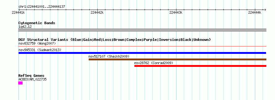 Variant DetailsVariant: nsv945331| Internal ID | 18592182 | | Landmark | | | Location Information | | | Cytoband | 1q42.12 | | Allele length | | Assembly | Allele length | | hg38 | 3137 | | hg19 | 3137 | | hg18 | 3137 |