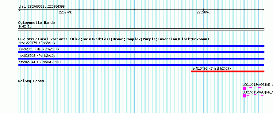 Variant DetailsVariant: nsv945344| Internal ID | 18592195 | | Landmark | | | Location Information | | | Cytoband | 1q42.13 | | Allele length | | Assembly | Allele length | | hg38 | 17838 | | hg19 | 17838 | | hg18 | 17838 |