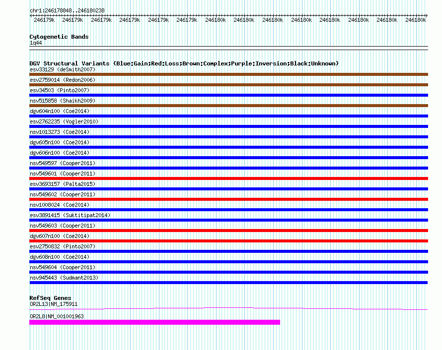 Variant DetailsVariant: nsv945443| Internal ID | 18592294 | | Landmark | | | Location Information | | | Cytoband | 1q44 | | Allele length | | Assembly | Allele length | | hg38 | 1391 | | hg19 | 1391 | | hg18 | 1391 |