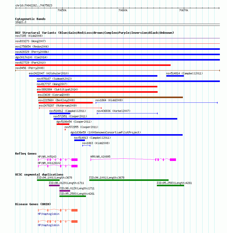 | | Variant Type | CNV gain+loss | | Copy Number | | | Allele State | | | Allele Origin | | | Probe Count | | | Validation Flag | | | Merged Status | M | | Merged Variants | | | Supporting Variants | nssv26646, nssv25843, nssv28117, nssv25088, nssv20659, nssv24326, nssv24270, nssv26659, nssv27053, nssv25864, nssv25437 | | Samples | NA18504, NA12155, NA18860, NA18572, NA19221, NA18517, NA19240, NA19173 | | Known Genes | HP, HPR | | Method | Oligo aCGH | | Analysis | Statistical threshold = 5.0, minimum +/- log2 ratio = 0.25 and minimum number of probes = 2 | | Platform | Agilent-015686 Custom Human 244K CGH Microarray | | Comments | | | Reference | Perry_et_al_2008 | | Pubmed ID | 18304495 | | Accession Number(s) | nsv9456