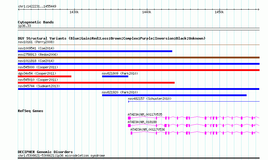 Variant DetailsVariant: nsv945744| Internal ID | 18592595 | | Landmark | | | Location Information | | | Cytoband | 1p36.33 | | Allele length | | Assembly | Allele length | | hg38 | 33219 | | hg19 | 33219 | | hg18 | 33219 |
