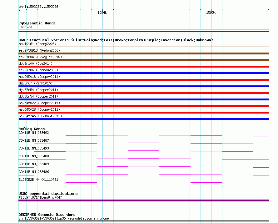 | Variant Type | CNV duplication | Copy Number | | Allele State | | Allele Origin | | Probe Count | | Validation Flag | | Merged Status | M | Merged Variants | | Supporting Variants | nssv1751667, nssv1751677, nssv1751674, nssv1751673, nssv1751669, nssv1751670, nssv1751668, nssv1751672, nssv1751676, nssv1751671 | Samples | HGDP01284, HGDP00665, HGDP00998, HGDP00521, HGDP00778, HGDP01307, HGDP00542, HGDP01029, HGDP00456, HGDP00927 | Known Genes | CDK11B, SLC35E2B | Method | Sequencing | Analysis | lineage specific fixed duplications | Platform | Not reported | Comments | | Reference | Sudmant_et_al_2013 | Pubmed ID | 23825009 | Accession Number(s) | nsv945745