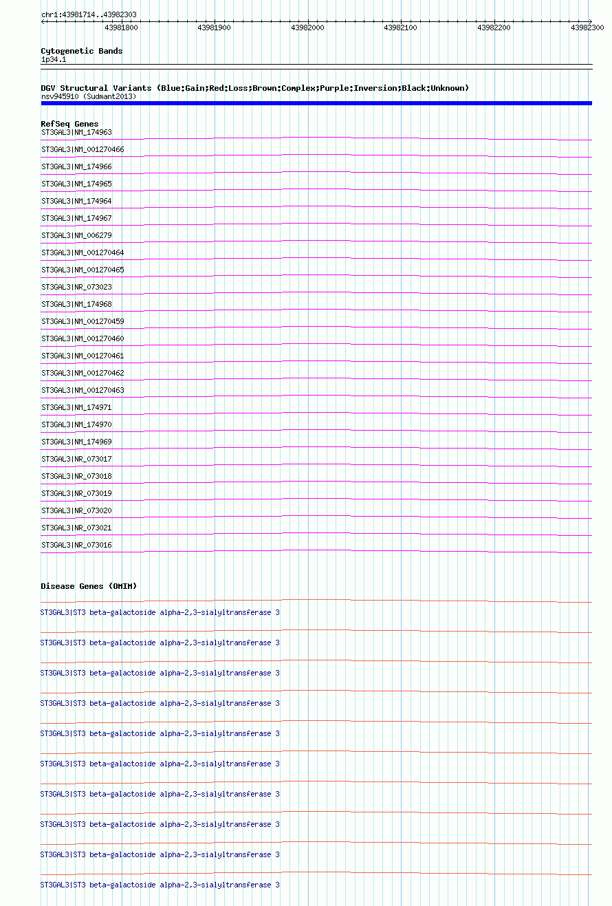 Variant DetailsVariant: nsv945910| Internal ID | 18592760 | | Landmark | | | Location Information | | | Cytoband | 1p34.1 | | Allele length | | Assembly | Allele length | | hg38 | 590 | | hg19 | 590 | | hg18 | 590 |