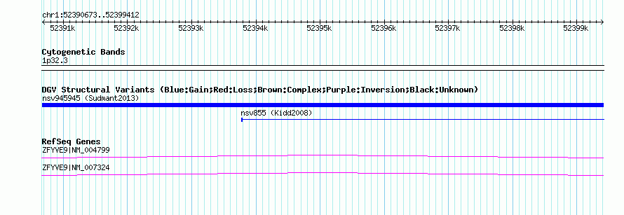 Variant DetailsVariant: nsv945945| Internal ID | 18592795 | | Landmark | | | Location Information | | | Cytoband | 1p32.3 | | Allele length | | Assembly | Allele length | | hg38 | 8740 | | hg19 | 8740 | | hg18 | 8740 |