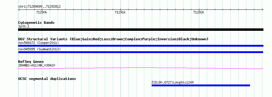 Variant DetailsVariant: nsv945995| Internal ID | 18246159 | | Landmark | | | Location Information | | | Cytoband | 1p31.1 | | Allele length | | Assembly | Allele length | | hg38 | 3114 | | hg19 | 3114 | | hg18 | 3114 |