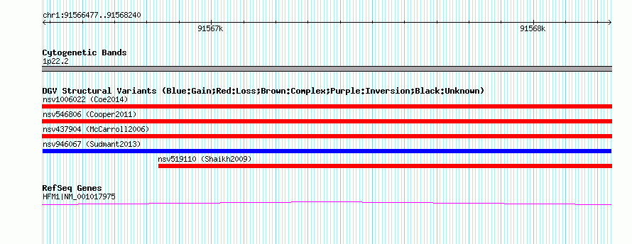 Variant DetailsVariant: nsv946067| Internal ID | 18592917 | | Landmark | | | Location Information | | | Cytoband | 1p22.2 | | Allele length | | Assembly | Allele length | | hg38 | 1764 | | hg19 | 1764 | | hg18 | 1764 |