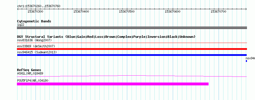 Variant DetailsVariant: nsv946415| Internal ID | 18593265 | | Landmark | | | Location Information | | | Cytoband | 1q22 | | Allele length | | Assembly | Allele length | | hg38 | 501 | | hg19 | 501 | | hg18 | 501 |