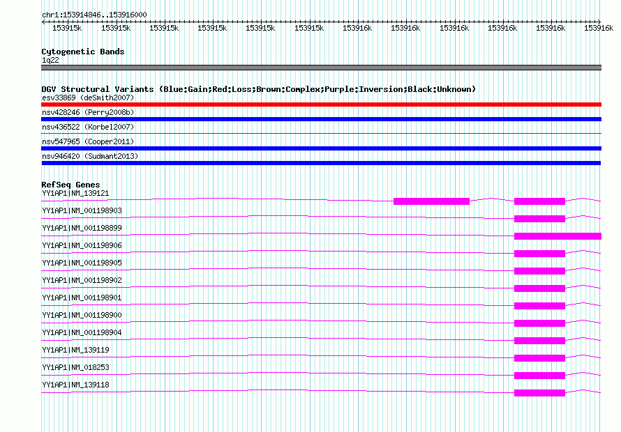 Variant DetailsVariant: nsv946420| Internal ID | 18246584 | | Landmark | | | Location Information | | | Cytoband | 1q22 | | Allele length | | Assembly | Allele length | | hg38 | 1155 | | hg19 | 1155 | | hg18 | 1155 |