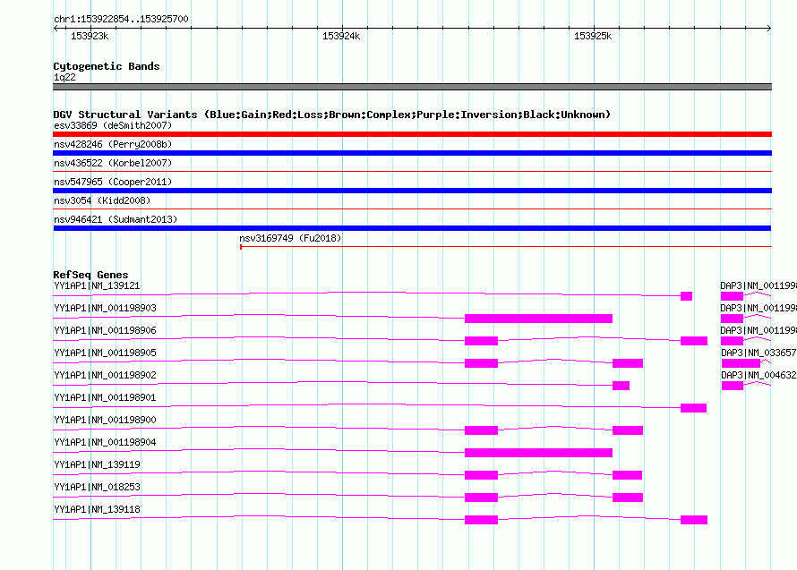 Variant DetailsVariant: nsv946421| Internal ID | 18593271 | | Landmark | | | Location Information | | | Cytoband | 1q22 | | Allele length | | Assembly | Allele length | | hg38 | 2847 | | hg19 | 2847 | | hg18 | 2847 |
