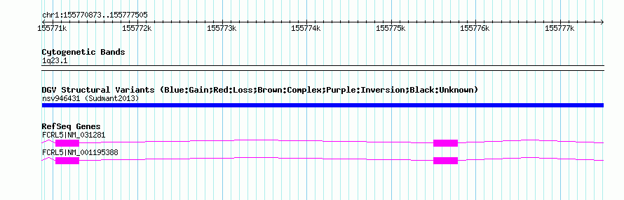 Variant DetailsVariant: nsv946431| Internal ID | 18593281 | | Landmark | | | Location Information | | | Cytoband | 1q23.1 | | Allele length | | Assembly | Allele length | | hg38 | 6633 | | hg19 | 6633 | | hg18 | 6633 |
