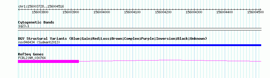 Variant DetailsVariant: nsv946434| Internal ID | 18593284 | | Landmark | | | Location Information | | | Cytoband | 1q23.1 | | Allele length | | Assembly | Allele length | | hg38 | 789 | | hg19 | 789 | | hg18 | 789 |
