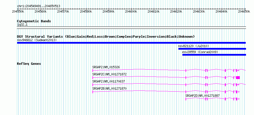 | | Variant Type | CNV duplication | | Copy Number | | | Allele State | | | Allele Origin | | | Probe Count | | | Validation Flag | | | Merged Status | M | | Merged Variants | | | Supporting Variants | nssv1815353, nssv1815352, nssv1815355, nssv1815349, nssv1815346, nssv1815351, nssv1815350, nssv1815354, nssv1815347, nssv1815348 | | Samples | HGDP01284, HGDP00665, HGDP00998, HGDP00521, HGDP00778, HGDP01307, HGDP00542, HGDP01029, HGDP00456, HGDP00927 | | Known Genes | SRGAP2, SRGAP2B, SRGAP2C, SRGAP2D | | Method | Sequencing | | Analysis | lineage specific fixed duplications | | Platform | Not reported | | Comments | | | Reference | Sudmant_et_al_2013 | | Pubmed ID | 23825009 | | Accession Number(s) | nsv946612