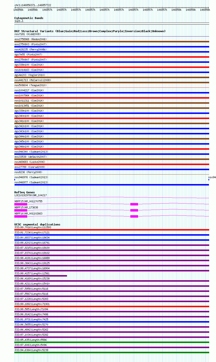 Variant DetailsVariant: nsv946977| Internal ID | 18247141 | | Landmark | | | Location Information | | | Cytoband | 1q21.1 | | Allele length | | Assembly | Allele length | | hg38 | 29909 | | hg19 | 1352 | | hg18 | 1352 |