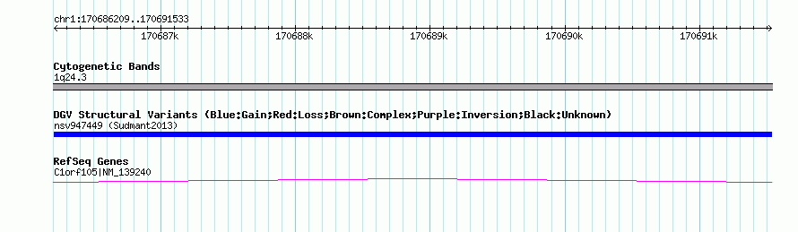Variant DetailsVariant: nsv947449| Internal ID | 18594297 | | Landmark | | | Location Information | | | Cytoband | 1q24.3 | | Allele length | | Assembly | Allele length | | hg38 | 5325 | | hg19 | 5325 | | hg18 | 5325 |