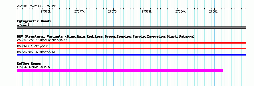Variant DetailsVariant: nsv947786| Internal ID | 18594633 | | Landmark | | | Location Information | | | Cytoband | 10p12.1 | | Allele length | | Assembly | Allele length | | hg38 | 6772 | | hg19 | 6772 | | hg18 | 6772 |