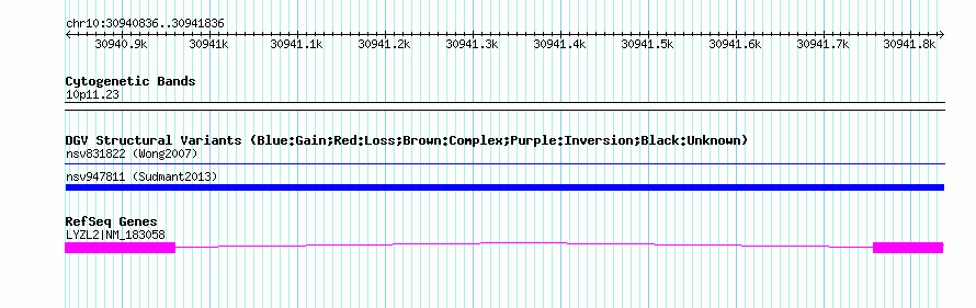 Variant DetailsVariant: nsv947811| Internal ID | 18594658 | | Landmark | | | Location Information | | | Cytoband | 10p11.23 | | Allele length | | Assembly | Allele length | | hg38 | 1001 | | hg19 | 1001 | | hg18 | 1001 |