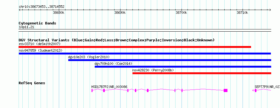Variant DetailsVariant: nsv947859| Internal ID | 18594706 | | Landmark | | | Location Information | | | Cytoband | 10p11.1 | | Allele length | | Assembly | Allele length | | hg38 | 41100 | | hg19 | 41100 | | hg18 | 41100 |