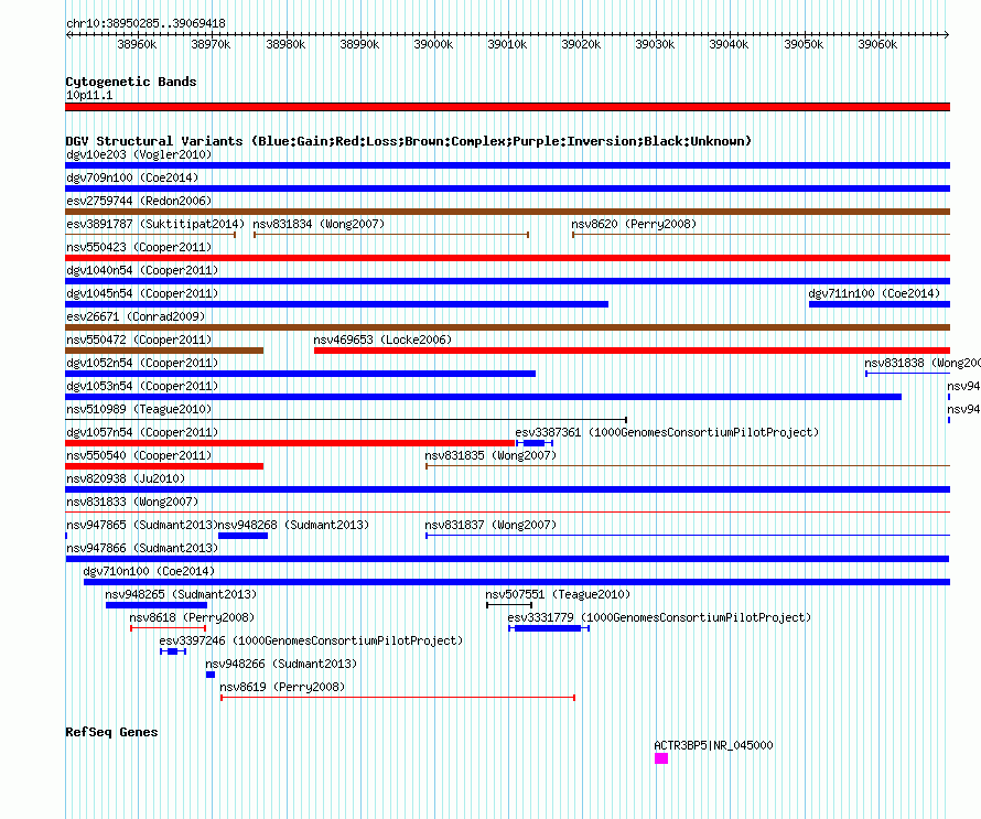 Variant DetailsVariant: nsv947866| Internal ID | 18594713 | | Landmark | | | Location Information | | | Cytoband | 10p11.1 | | Allele length | | Assembly | Allele length | | hg38 | 119134 | | hg19 | 119134 | | hg18 | 119134 |