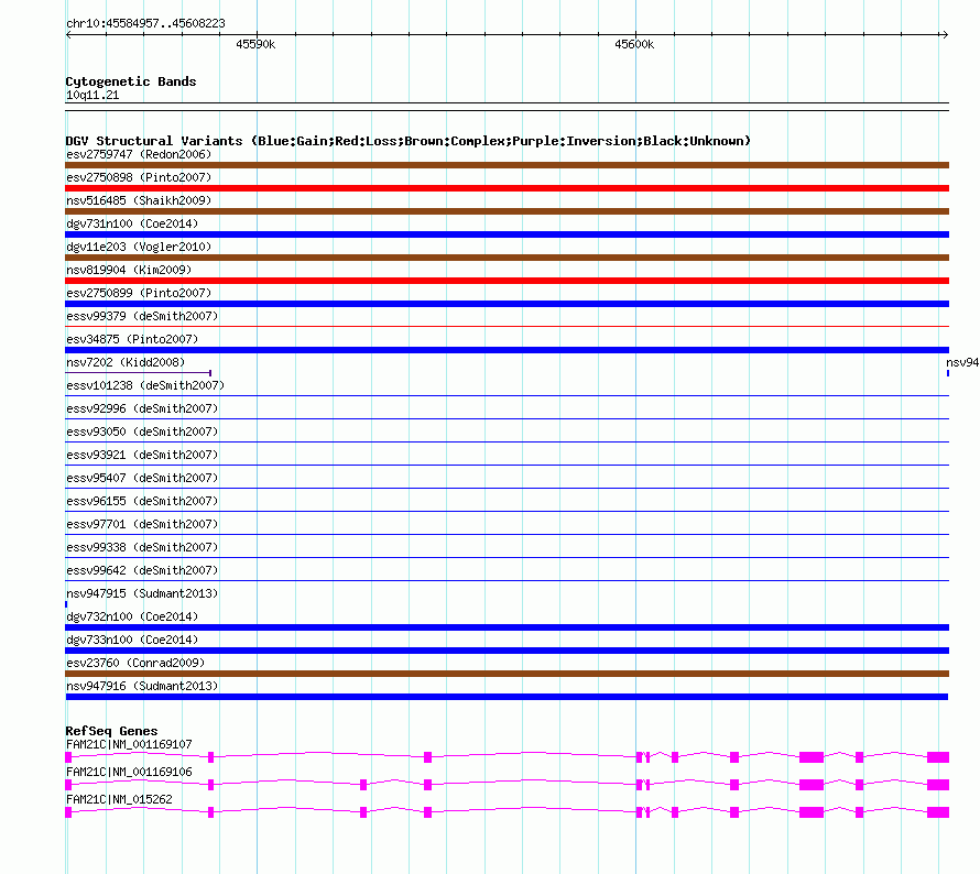 Variant DetailsVariant: nsv947916| Internal ID | 18594762 | | Landmark | | | Location Information | | | Cytoband | 10q11.21 | | Allele length | | Assembly | Allele length | | hg38 | 23267 | | hg19 | 23267 | | hg18 | 23267 |
