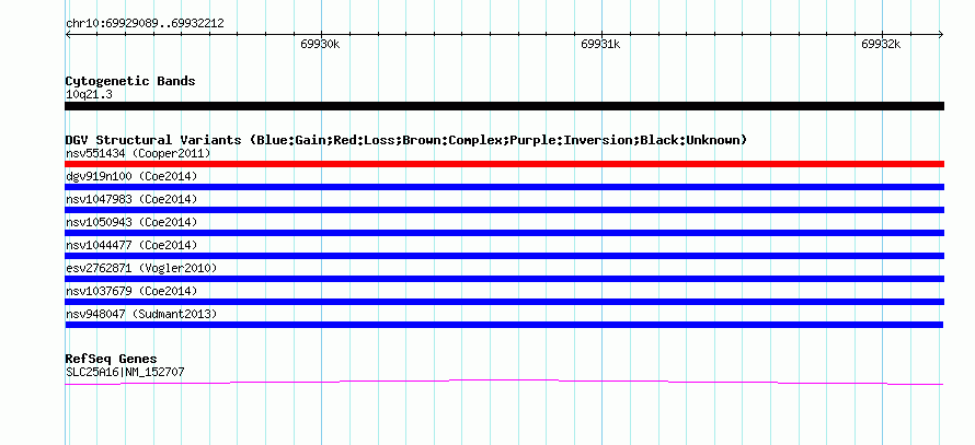 Variant DetailsVariant: nsv948047| Internal ID | 18594893 | | Landmark | | | Location Information | | | Cytoband | 10q21.3 | | Allele length | | Assembly | Allele length | | hg38 | 3124 | | hg19 | 3124 | | hg18 | 3124 |