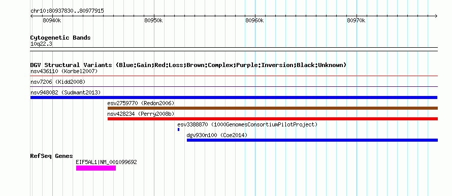 Variant DetailsVariant: nsv948082| Internal ID | 18594928 | | Landmark | | | Location Information | | | Cytoband | 10q22.3 | | Allele length | | Assembly | Allele length | | hg38 | 40086 | | hg19 | 40086 | | hg18 | 40086 |