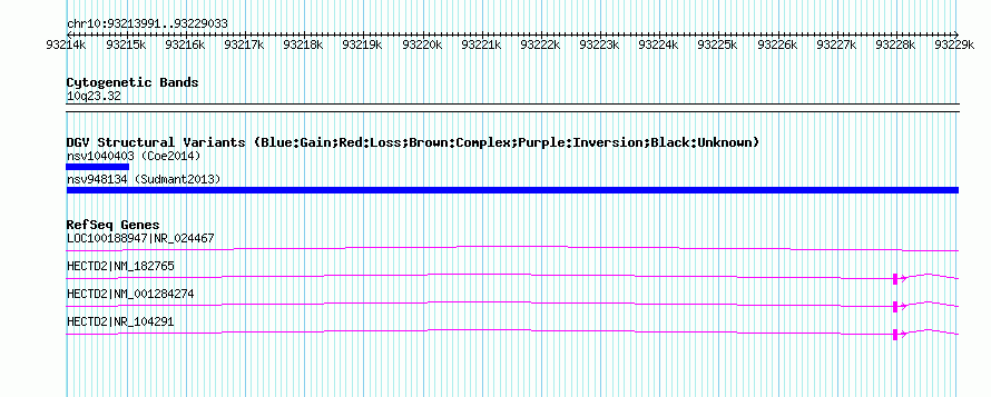 | | Variant Type | CNV duplication | | Copy Number | | | Allele State | | | Allele Origin | | | Probe Count | | | Validation Flag | | | Merged Status | M | | Merged Variants | | | Supporting Variants | nssv1862895, nssv1862892, nssv1862890, nssv1862897, nssv1862898, nssv1862899, nssv1862896, nssv1862893, nssv1862891, nssv1862894 | | Samples | HGDP01284, HGDP00665, HGDP00998, HGDP00521, HGDP00778, HGDP01307, HGDP00542, HGDP01029, HGDP00456, HGDP00927 | | Known Genes | HECTD2, LOC100188947 | | Method | Sequencing | | Analysis | lineage specific fixed duplications | | Platform | Not reported | | Comments | | | Reference | Sudmant_et_al_2013 | | Pubmed ID | 23825009 | | Accession Number(s) | nsv948134