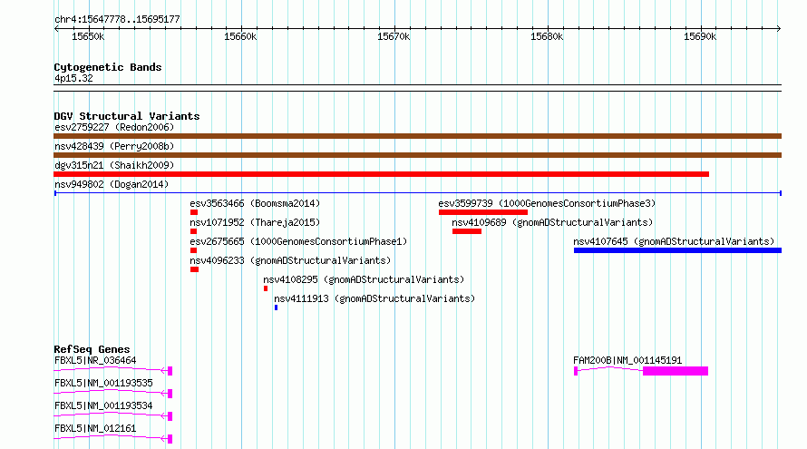 Variant DetailsVariant: nsv949802Internal ID | 16951989 | Landmark | | Location Information | | Cytoband | 4p15.32 | Allele length | Assembly | Allele length | hg38 | 47400 | hg19 | 47400 |