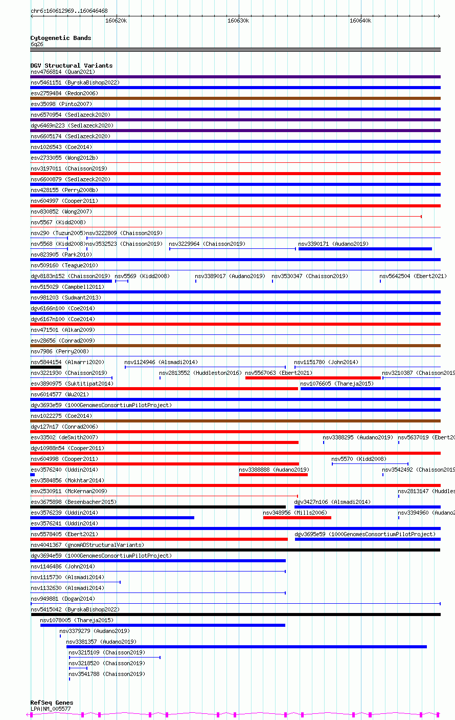 Variant DetailsVariant: nsv949881| Internal ID | 17298755 | | Landmark | | | Location Information | | | Cytoband | 6q26 | | Allele length | | Assembly | Allele length | | hg38 | 33500 | | hg19 | 33500 |