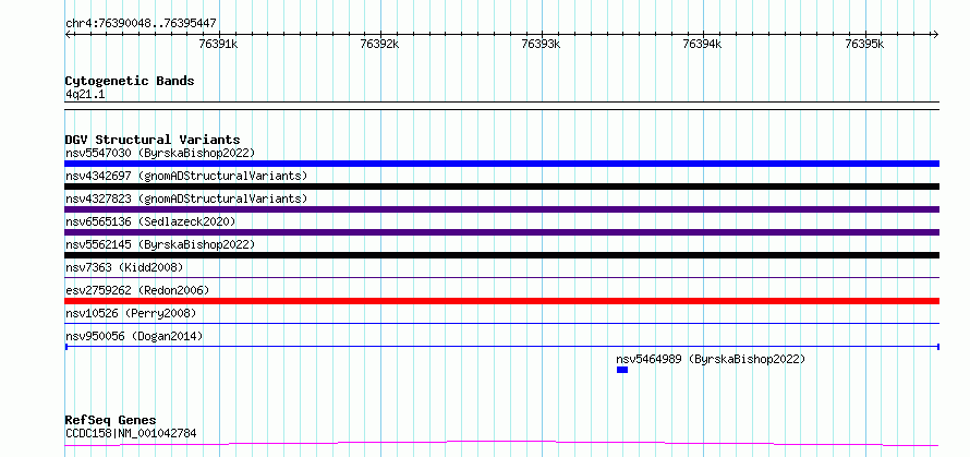 Variant DetailsVariant: nsv950056| Internal ID | 17298930 | | Landmark | | | Location Information | | | Cytoband | 4q21.1 | | Allele length | | Assembly | Allele length | | hg38 | 5400 | | hg19 | 5400 |