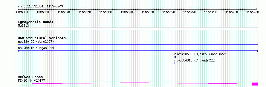 Variant DetailsVariant: nsv950116| Internal ID | 17298990 | | Landmark | | | Location Information | | | Cytoband | 5q22.3 | | Allele length | | Assembly | Allele length | | hg38 | 11400 | | hg19 | 11400 |