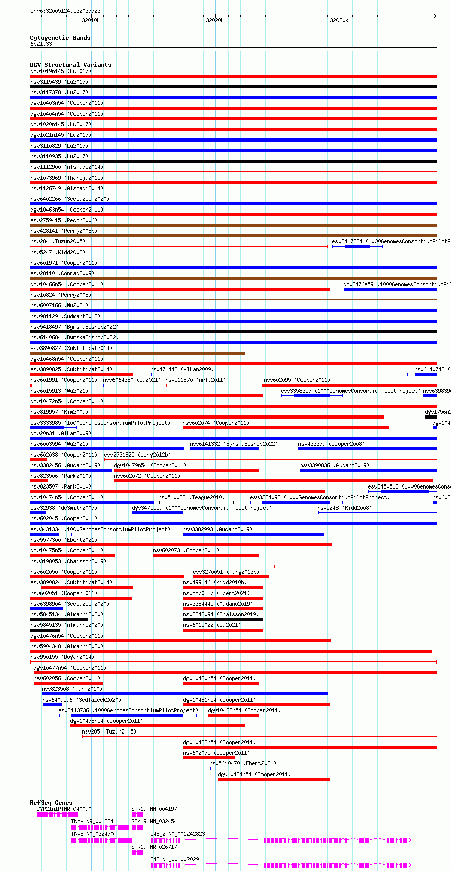Variant DetailsVariant: nsv950155| Internal ID | 17299029 | | Landmark | | | Location Information | | | Cytoband | 6p21.33 | | Allele length | | Assembly | Allele length | | hg38 | 32600 | | hg19 | 32600 |