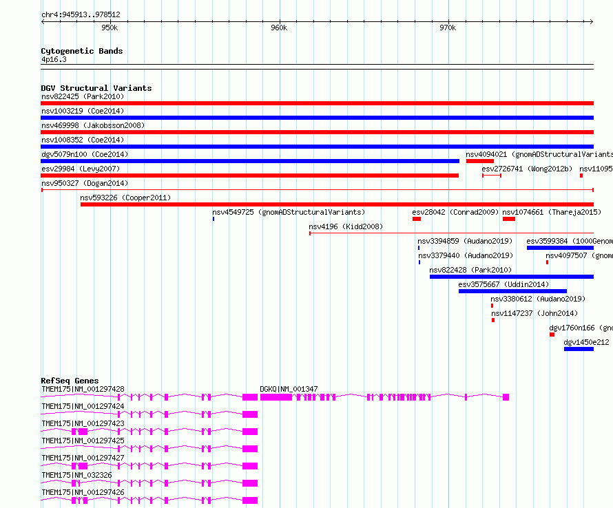 | | Variant Type | CNV deletion | | Copy Number | | | Allele State | | | Allele Origin | | | Probe Count | | | Validation Flag | | | Merged Status | M | | Merged Variants | | | Supporting Variants | nssv2996616 | | Samples | BILGI_BIOE | | Known Genes | DGKQ, TMEM175 | | Method | Sequencing | | Analysis | | | Platform | Illumina HiSeq 2000 | | Comments | | | Reference | Dogan_et_al_2014 | | Pubmed ID | 24416366 | | Accession Number(s) | nsv950327