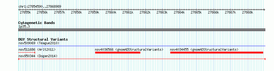 Variant DetailsVariant: nsv950344| Internal ID | 16952531 | | Landmark | | | Location Information | | | Cytoband | 1p35.3 | | Allele length | | Assembly | Allele length | | hg38 | 14400 | | hg19 | 14400 |