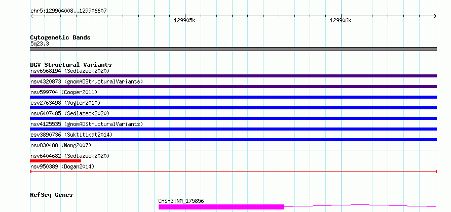 Variant DetailsVariant: nsv950389| Internal ID | 17299263 | | Landmark | | | Location Information | | | Cytoband | 5q23.3 | | Allele length | | Assembly | Allele length | | hg38 | 2600 | | hg19 | 2600 |