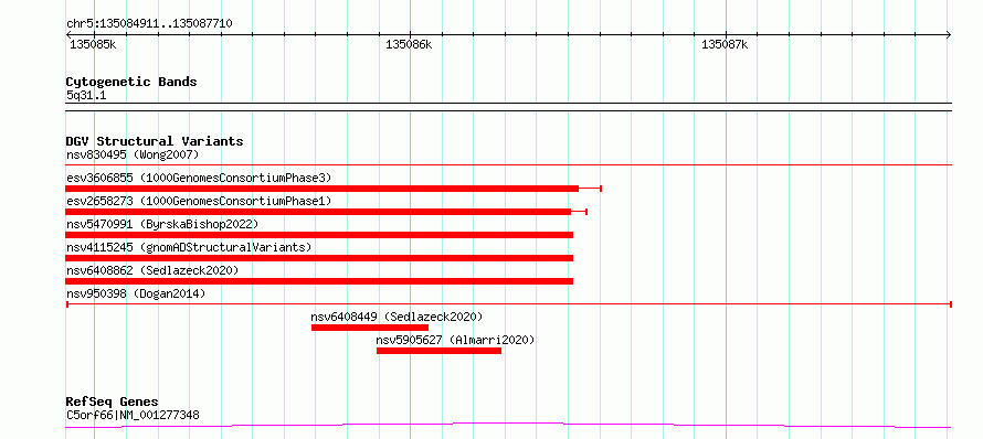 Variant DetailsVariant: nsv950398| Internal ID | 17299272 | | Landmark | | | Location Information | | | Cytoband | 5q31.1 | | Allele length | | Assembly | Allele length | | hg38 | 2800 | | hg19 | 2800 |