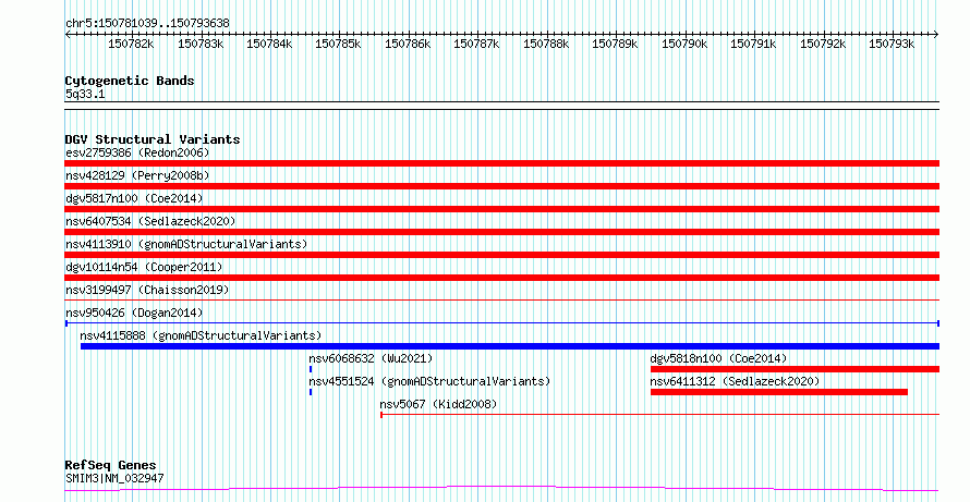 Variant DetailsVariant: nsv950426| Internal ID | 17299300 | | Landmark | | | Location Information | | | Cytoband | 5q33.1 | | Allele length | | Assembly | Allele length | | hg38 | 12600 | | hg19 | 12600 |