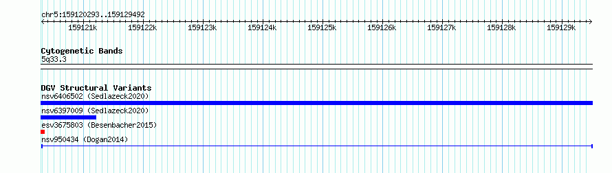 Variant DetailsVariant: nsv950434| Internal ID | 17299308 | | Landmark | | | Location Information | | | Cytoband | 5q33.3 | | Allele length | | Assembly | Allele length | | hg38 | 9200 | | hg19 | 9200 |