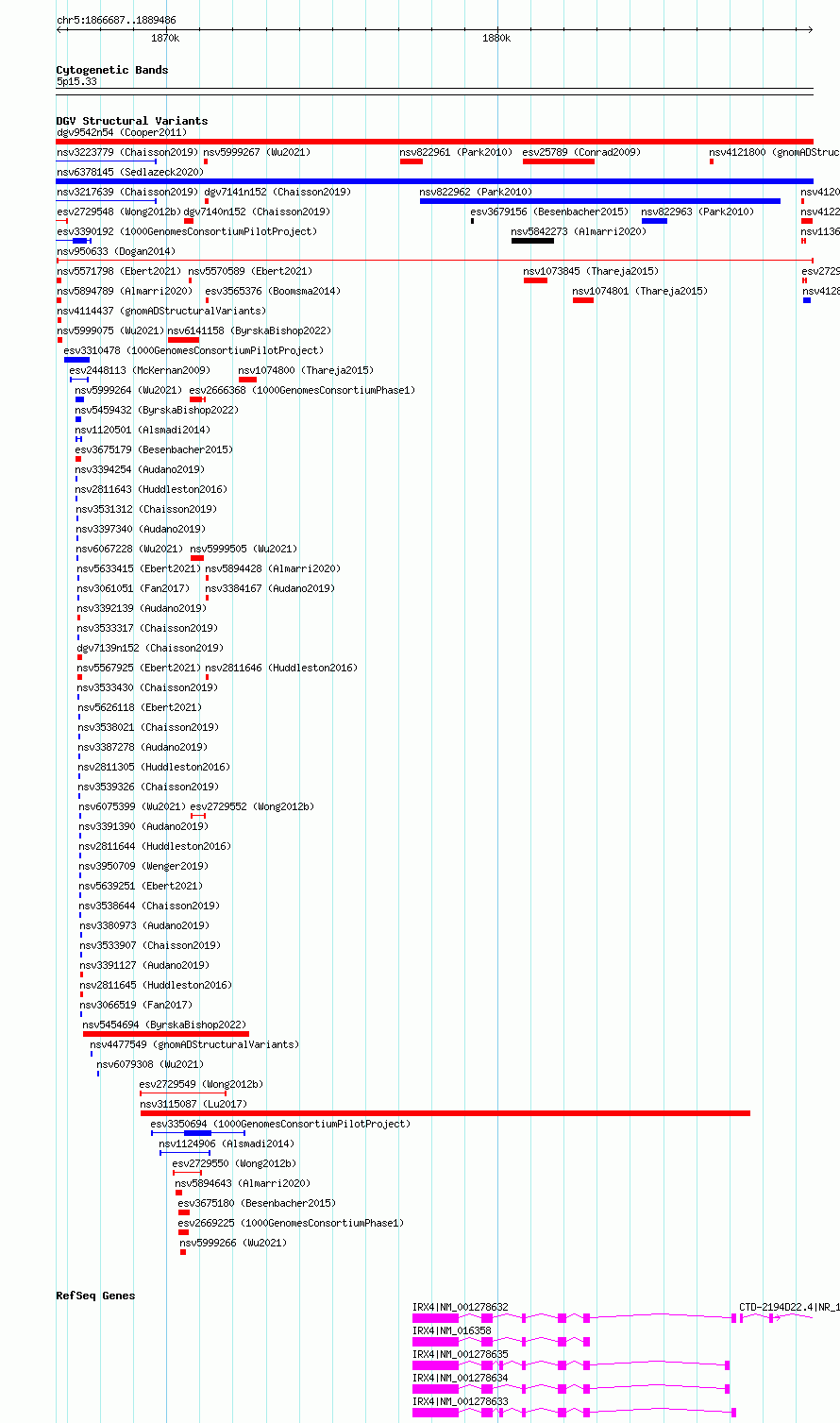 Variant DetailsVariant: nsv950633| Internal ID | 17299507 | | Landmark | | | Location Information | | | Cytoband | 5p15.33 | | Allele length | | Assembly | Allele length | | hg38 | 22800 | | hg19 | 22800 |