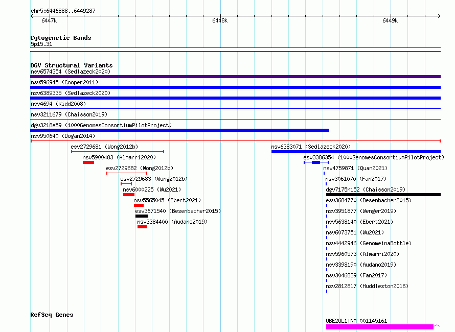 Variant DetailsVariant: nsv950640| Internal ID | 17299514 | | Landmark | | | Location Information | | | Cytoband | 5p15.31 | | Allele length | | Assembly | Allele length | | hg38 | 2400 | | hg19 | 2400 |