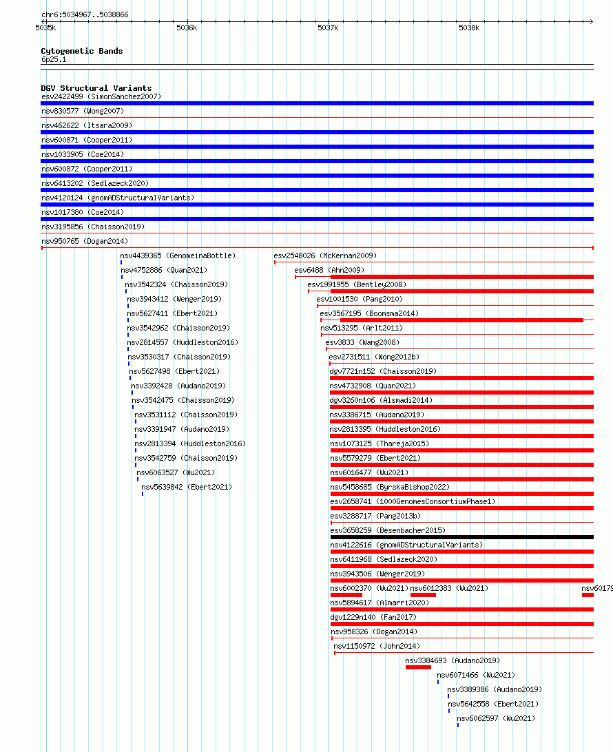Variant DetailsVariant: nsv950765| Internal ID | 17299639 | | Landmark | | | Location Information | | | Cytoband | 6p25.1 | | Allele length | | Assembly | Allele length | | hg38 | 3900 | | hg19 | 3900 |